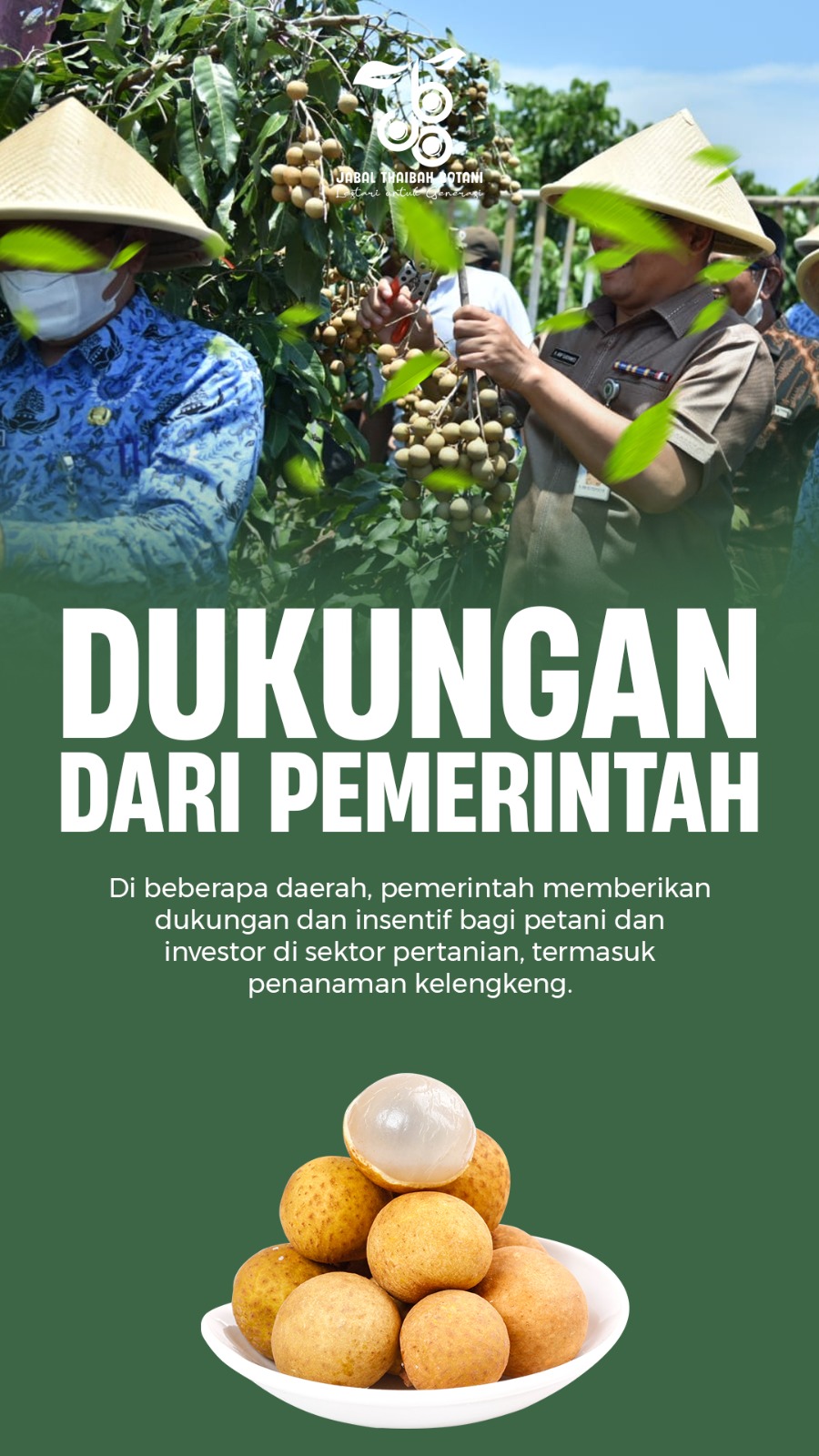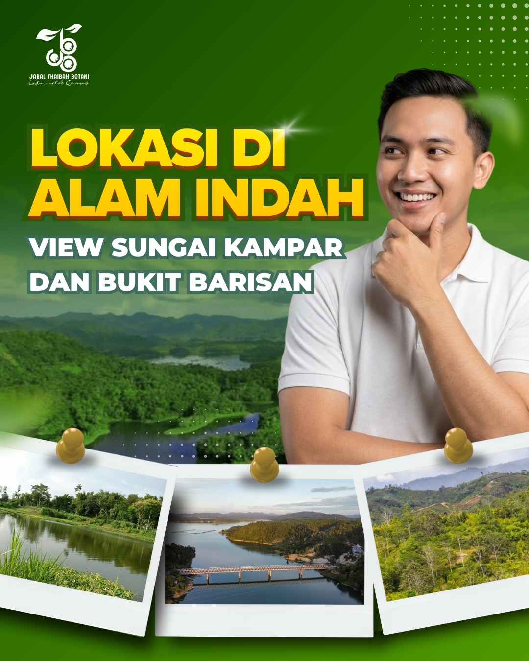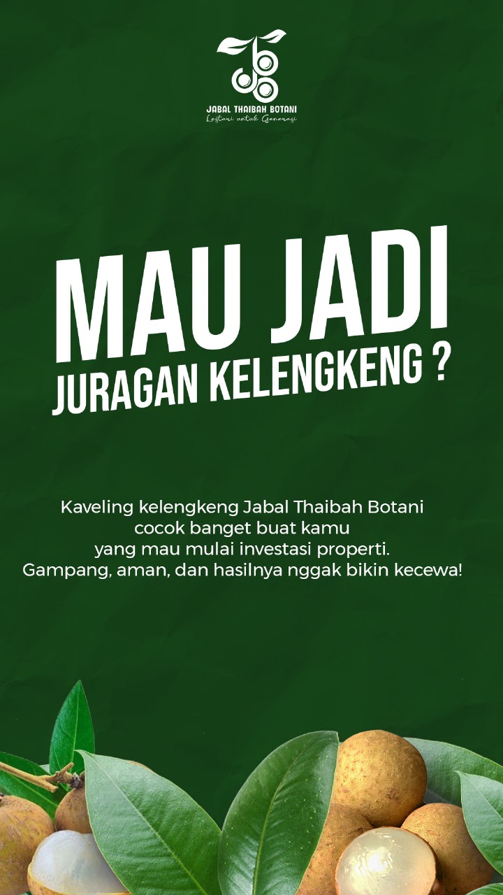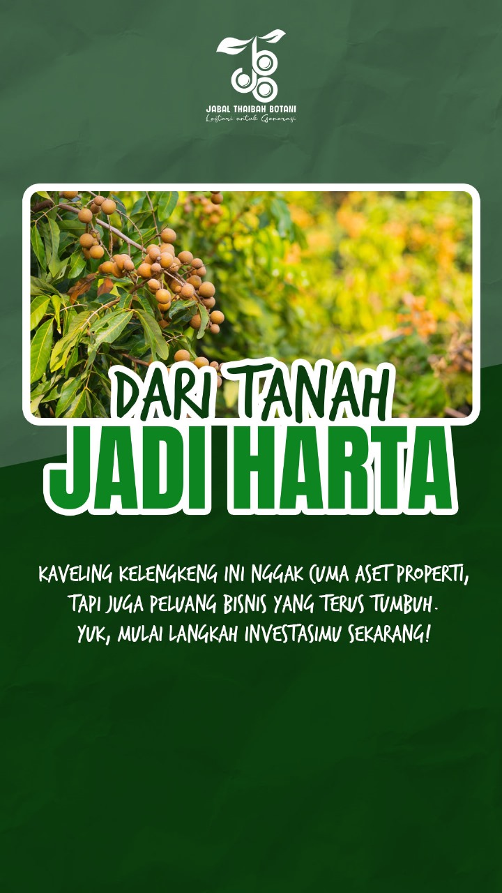 Jangan lewatkan kesempatan emas punya aset di Jabal Thaibah Botani! Bisa Liburan dan investasi di kawasan resort kami yang menawarkan pemandangan perbukitan, sungai, dan suasana yang mempesona. Tempat dimana Anda bisa memilikiKavling kelengkeng serta dapat membangun villa ekslusif baik untuk liburan bersama keluarga maupun untuk komersil. Selain berbagai fasilitas wisata yang akan dibangun, juga akan segera hadir wahana-wahan luar biasa yang akan melengkapi keseruan berlibur di Jabal Thaibah Botani.